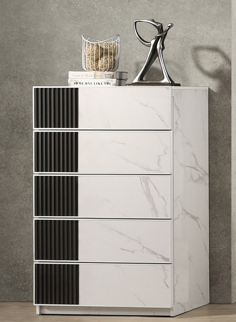 Introducing the Chloe Bedroom by J&M Furniture, a perfect fusion of modern design and luxurious comfort. The Chloe bed showcases a striking white and grey marble design, creating a clean and modern look. Black ribbed accents add depth and contrast, enhancing the overall aesthetic and making a bold statement in your bedroom.