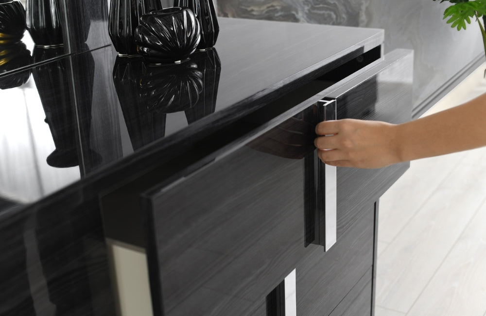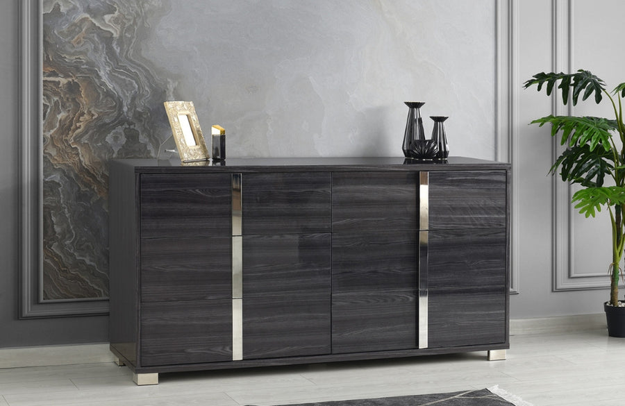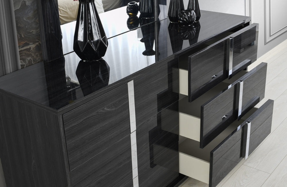 Sleek, modern, trendy, and durable are the traits of Giulia Bedroom collection.  This stylishly contemporary collection features sleek design elements like chrome drawer pulls that draw subtle attention. Additionally, Giulia is equipped with a modern LED light glow on the headboard. The collection features three magnetic colors: Gloss White, Gloss Pattern Grey, and Matte Gray Oak.