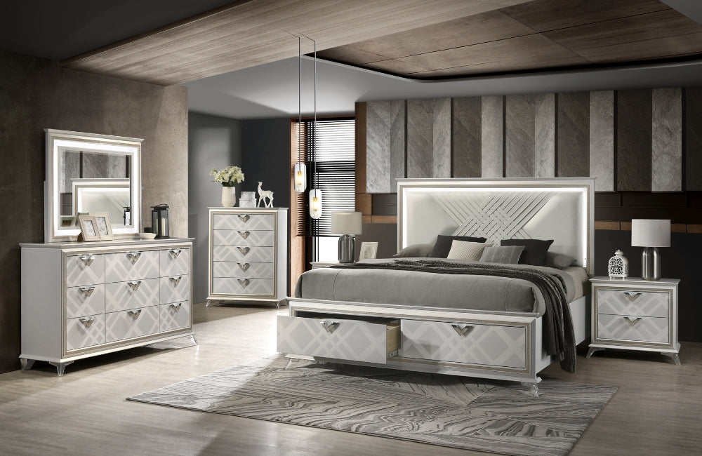 The set's mirror is equally impressive, boasting a built-in light that adds a sleek and practical touch to your bedroom. With its thoughtful design and premium materials, the Leon Bedroom Set is the perfect blend of style and practicality, ideal for elevating any modern space. **A box spring or bunky board is required for this bed.