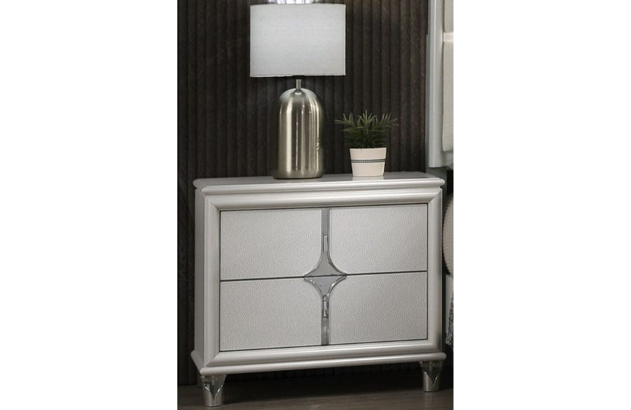 The Maeve Bedroom Set combines contemporary elegance with practical design. The bed is upholstered in soft boucle fabric, offering a unique textured look and luxurious comfort. An integrated LED light kit adds a modern touch, creating a warm and inviting ambiance that enhances the bedroom's atmosphere.