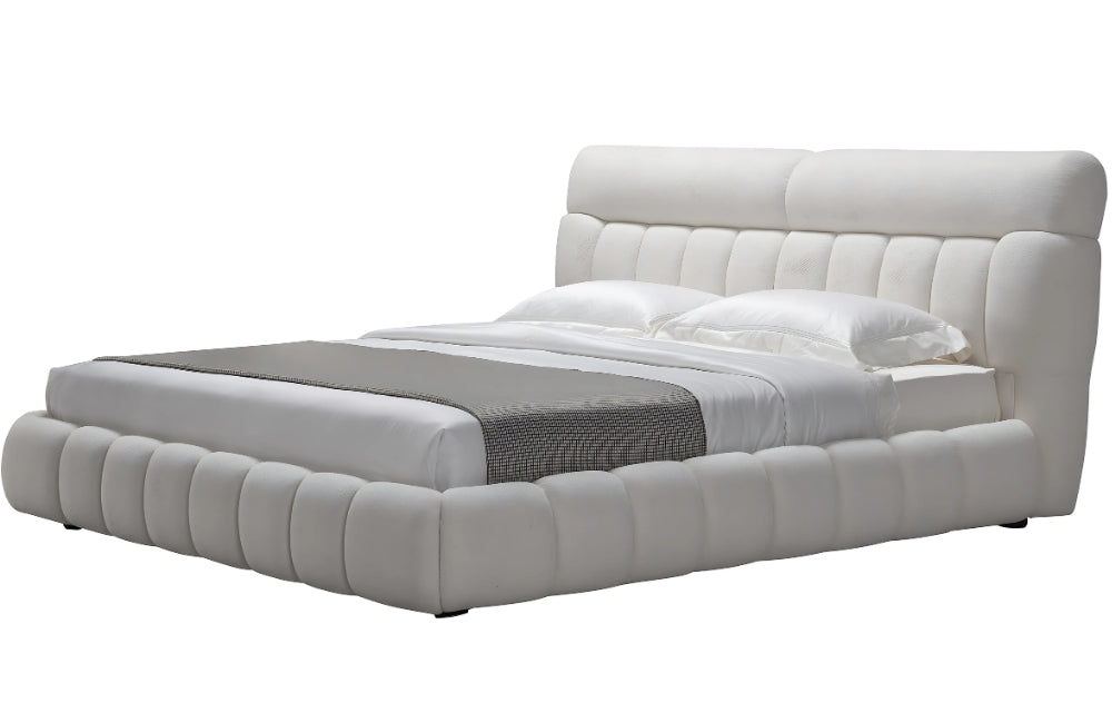 The Saskia Bed combines contemporary elegance with a minimalist aesthetic. Upholstered in crisp white fabric, this bed exudes sophistication and versatility, making it a perfect fit for any modern bedroom.