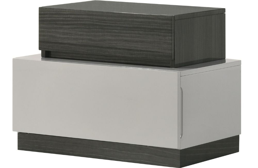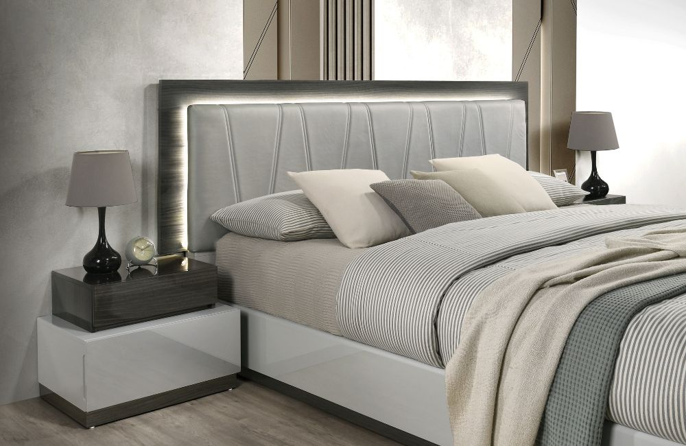 Introducing the Zoe Bedroom Set. This elegant set combines modern sophistication with functional design. Featuring a stunning light grey high-gloss finish contrasted by rich high gloss dark zebra grey, this set creates a sleek, contemporary ambiance for any bedroom. The bed’s headboard is upholstered in luxurious light grey eco-leather for added comfort, while the built-in LED light provides a soft, elegant glow to enhance the cozy atmosphere.