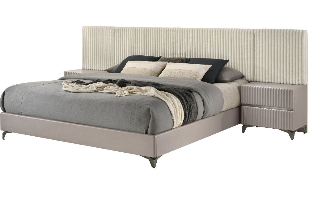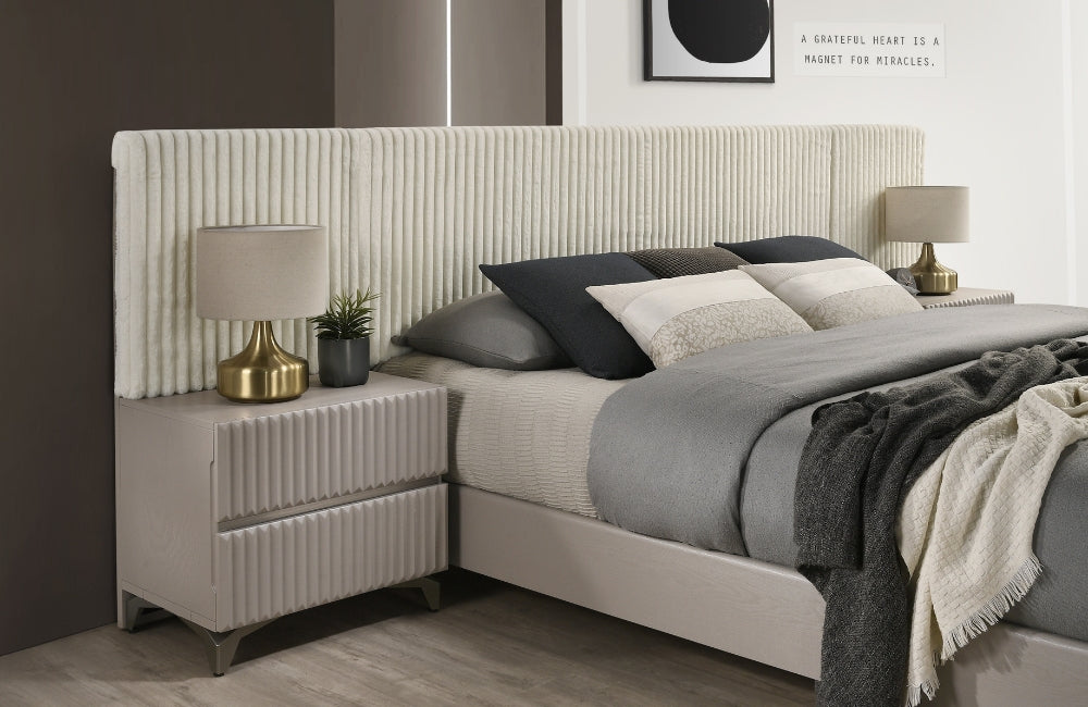 Introducing the Zoya Bedroom Set. This unique bedroom blends modern elegance with timeless sophistication. Featuring a sleek matte taupe wooden finish, the set exudes a warm, inviting ambiance. The case goods showcase a striking ribbed pattern on the drawer fronts, complemented by sturdy dark bronze legs, offering a subtle contrast that enhances the overall design.