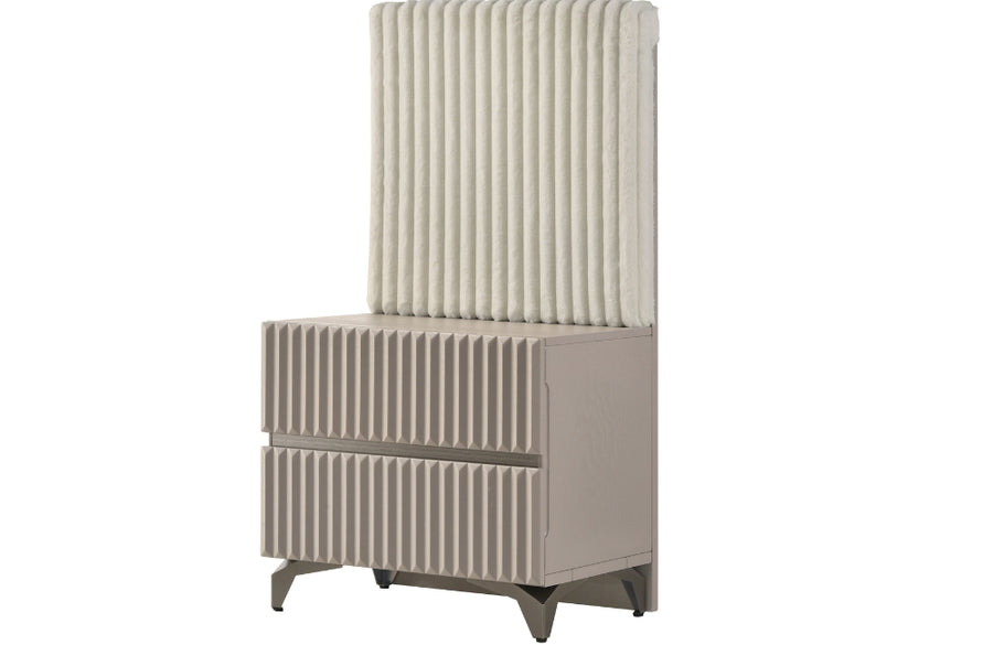 The bed is the centerpiece of this collection, upholstered in plush white faux fur fabric for a luxurious and comfortable touch. Perfectly balancing texture and simplicity, the Zoya Bedroom Set is designed to transform your bedroom into a serene and stylish retreat.