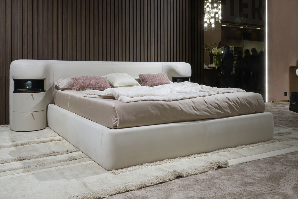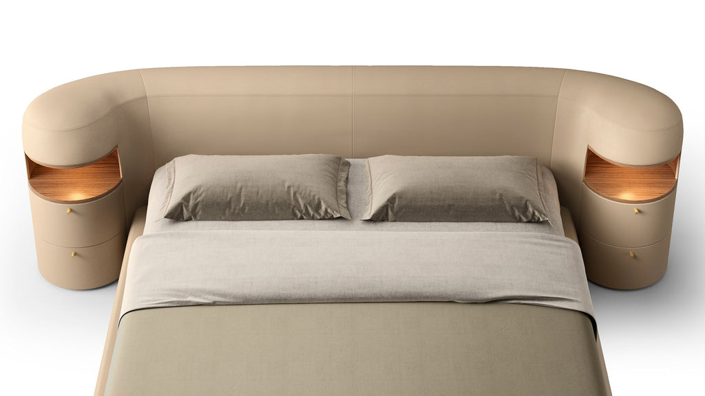 The Namibia bed features a curved headboard with open Canaletto walnut compartments and integrated