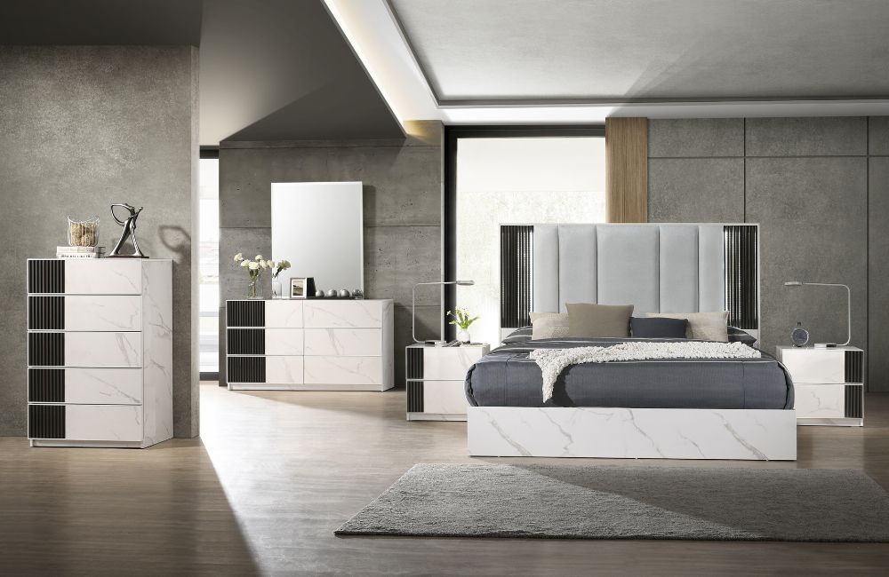Introducing the Chloe Bedroom by J&M Furniture, a perfect fusion of modern design and luxurious comfort. The Chloe bed showcases a striking white and grey marble design, creating a clean and modern look. Black ribbed accents add depth and contrast, enhancing the overall aesthetic and making a bold statement in your bedroom.