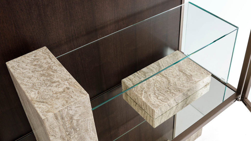 easily accommodates a transparent shelf. The result is a composition that balances solidity and