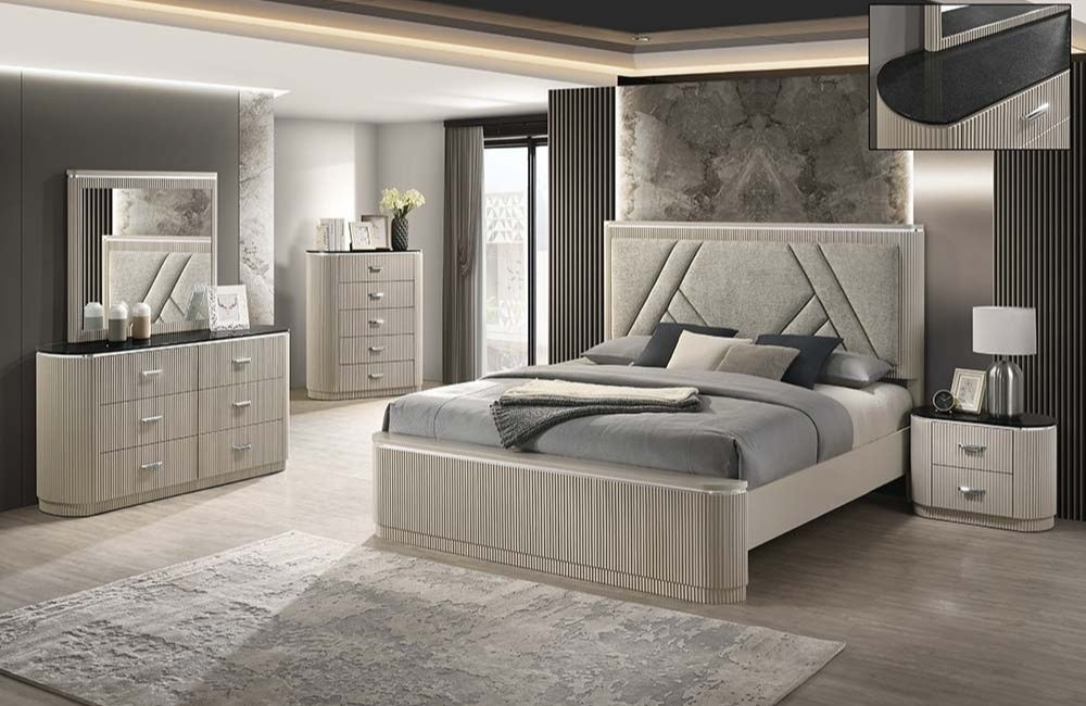 The Jensen Bedroom Set by J&M Furniture blends modern sophistication with luxurious detailing. Featuring a light beige ribbed design on the bed and case goods, this set adds texture and elegance to any bedroom. The black stone tops on the case goods create a striking contrast, enhancing the contemporary aesthetic.