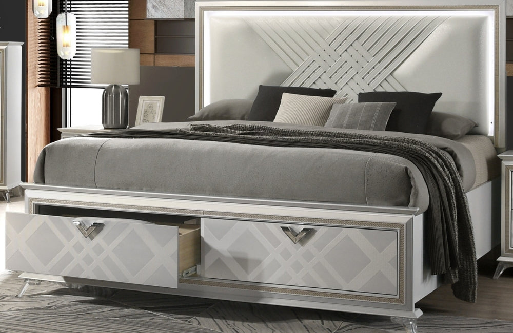 The Leon Bedroom Set by J&M Furniture combines modern functionality with refined luxury. The bed is upholstered in luxurious eco-leather, exuding elegance while offering comfort. Designed with convenience in mind, it features two spacious pull-out drawers at the foot, perfect for extra storage. An integrated LED light kit enhances the bed's contemporary style, creating a soft and inviting ambiance.