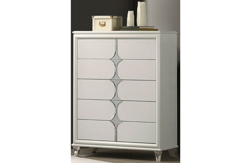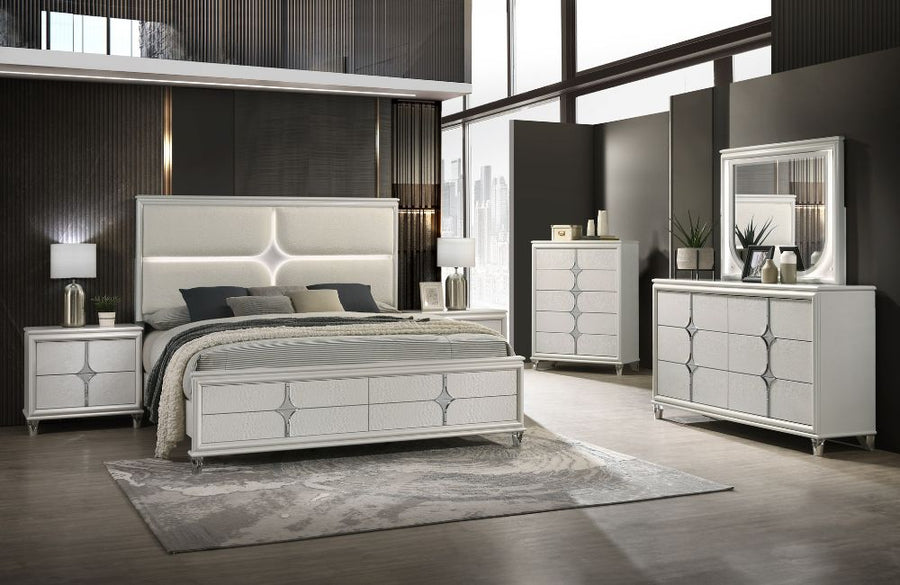 The Maeve Bedroom Set combines contemporary elegance with practical design. The bed is upholstered in soft boucle fabric, offering a unique textured look and luxurious comfort. An integrated LED light kit adds a modern touch, creating a warm and inviting ambiance that enhances the bedroom's atmosphere.