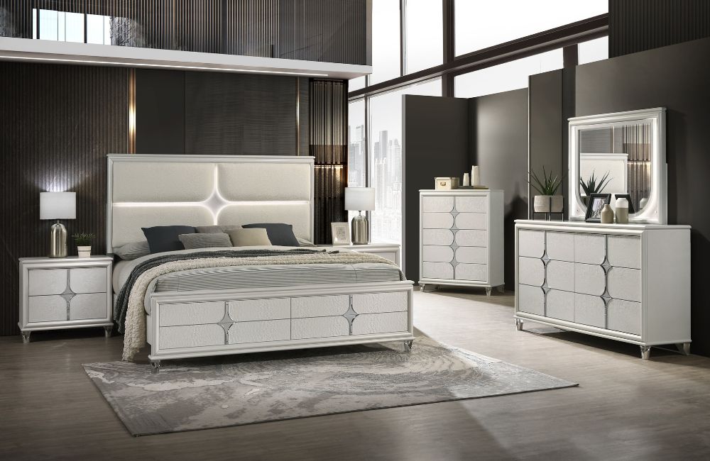Completing the set, the matching mirror features a built-in light, providing both functionality and style. With its premium materials, sleek design, and thoughtful details, the Maeve Bedroom Set is the perfect choice for transforming your bedroom into a stylish and serene retreat. **A box spring or bunky board is required for this bed.