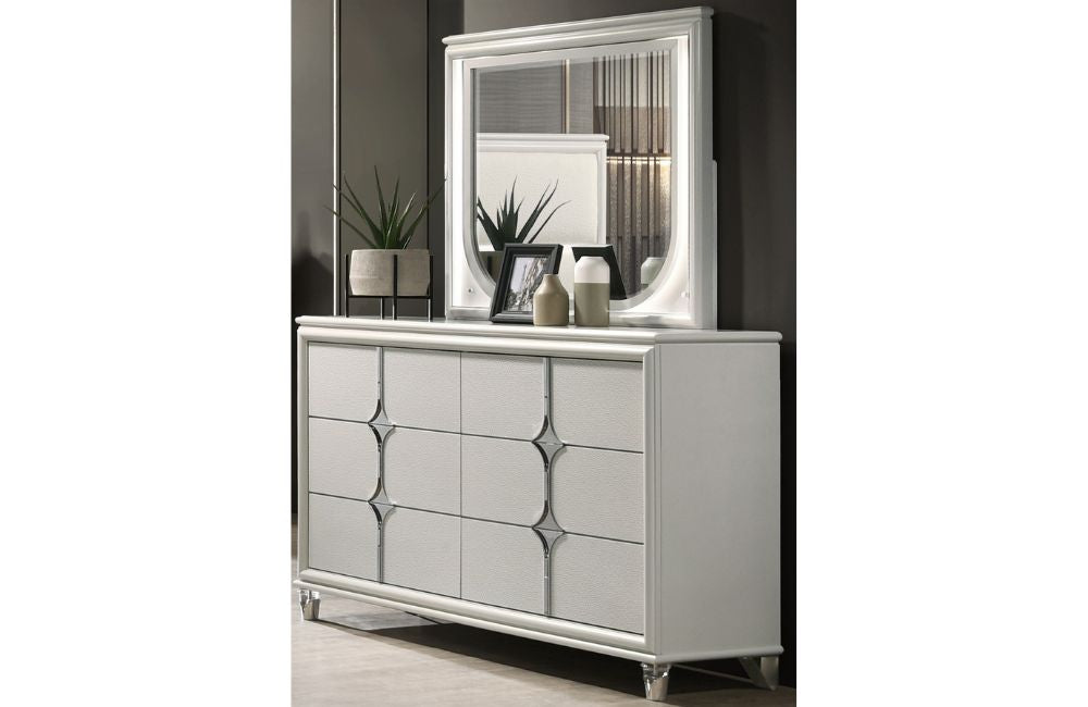 Completing the set, the matching mirror features a built-in light, providing both functionality and style. With its premium materials, sleek design, and thoughtful details, the Maeve Bedroom Set is the perfect choice for transforming your bedroom into a stylish and serene retreat. **A box spring or bunky board is required for this bed.