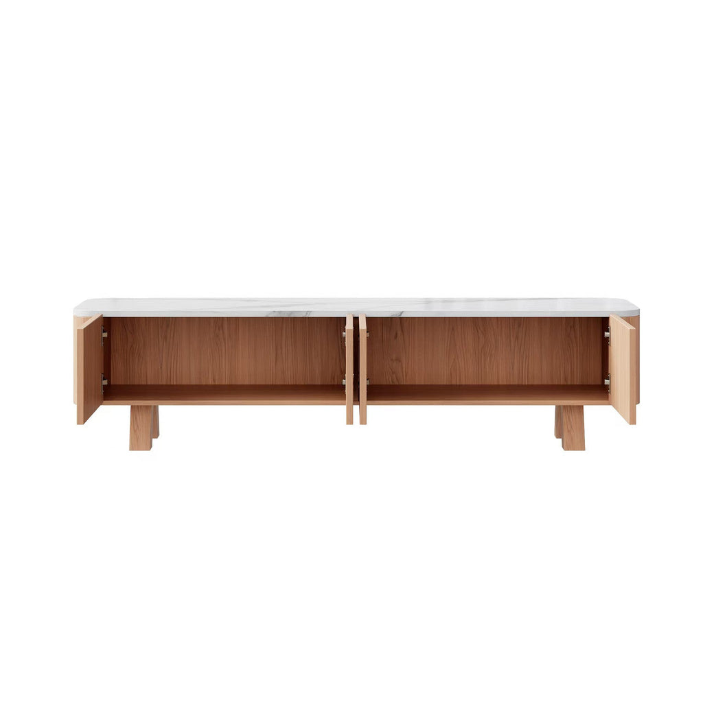 The Wynter TV stand features a striking white marble top paired with an oak veneer and a solid rubber wood frame, measuring 79 by 18 by 19.5 inches. This combination of materials ensures both durability and elegance, providing a sturdy base for your television while enhancing your living space with a sophisticated aesthetic. Its spacious design accommodates various media components, making it a functional and refined addition to any modern home.