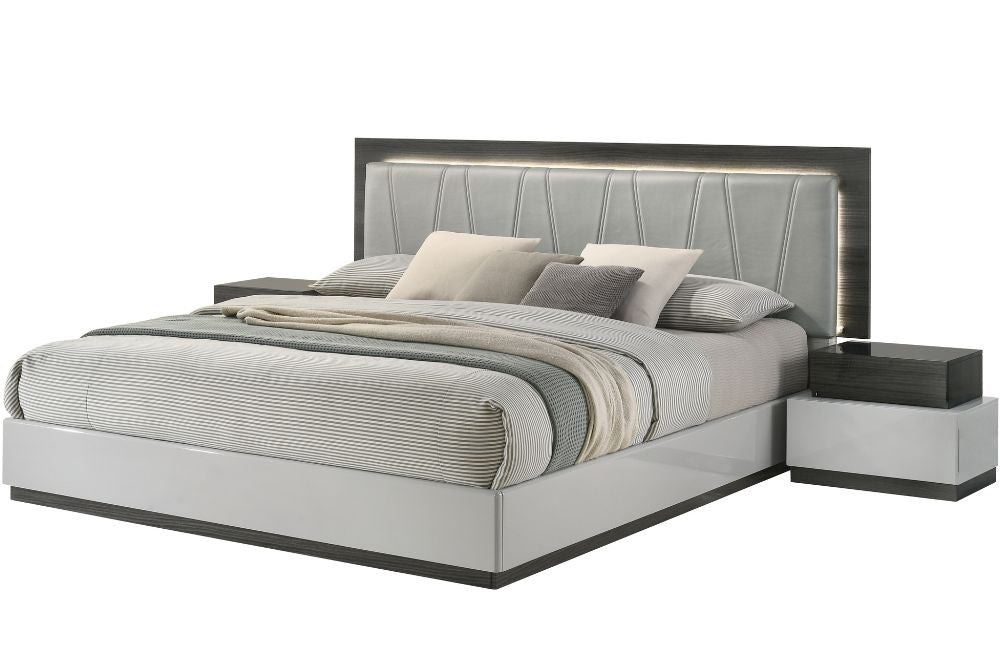 Introducing the Zoe Bedroom Set. This elegant set combines modern sophistication with functional design. Featuring a stunning light grey high-gloss finish contrasted by rich high gloss dark zebra grey, this set creates a sleek, contemporary ambiance for any bedroom. The bed’s headboard is upholstered in luxurious light grey eco-leather for added comfort, while the built-in LED light provides a soft, elegant glow to enhance the cozy atmosphere.