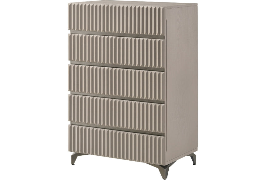 Introducing the Zoya Bedroom Set. This unique bedroom blends modern elegance with timeless sophistication. Featuring a sleek matte taupe wooden finish, the set exudes a warm, inviting ambiance. The case goods showcase a striking ribbed pattern on the drawer fronts, complemented by sturdy dark bronze legs, offering a subtle contrast that enhances the overall design.